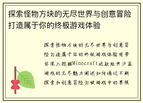 探索怪物方块的无尽世界与创意冒险打造属于你的终极游戏体验