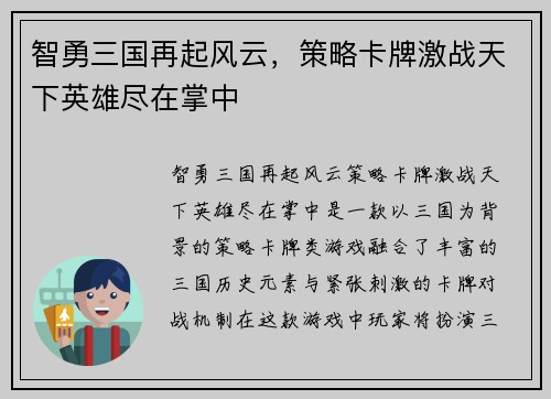 智勇三国再起风云,策略卡牌激战天下英雄尽在掌中