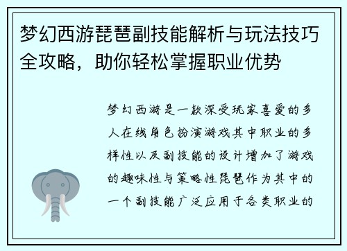 梦幻西游琵琶副技能解析与玩法技巧全攻略,助你轻松掌握职业优势